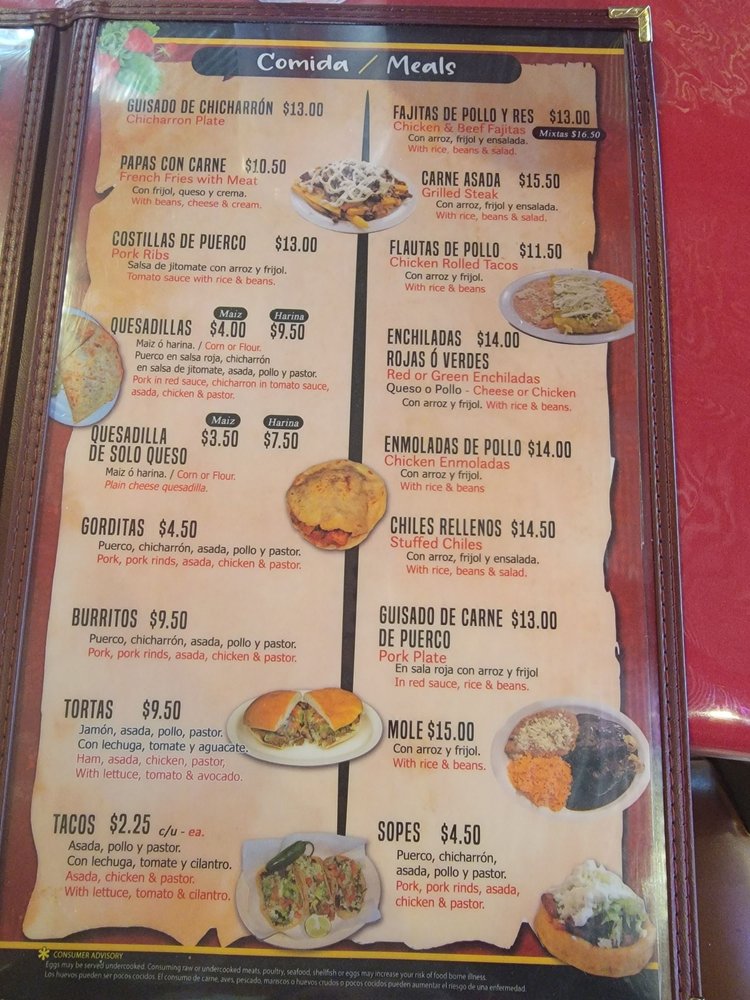 Maiz ó harina. / Corn or flour. Puerco en salsa roja, chicharrón en salsa de jitomate, asada, pollo y pastor. Pork in red sauce, chicharron in tomato sauce, asada, chicken & pastor.