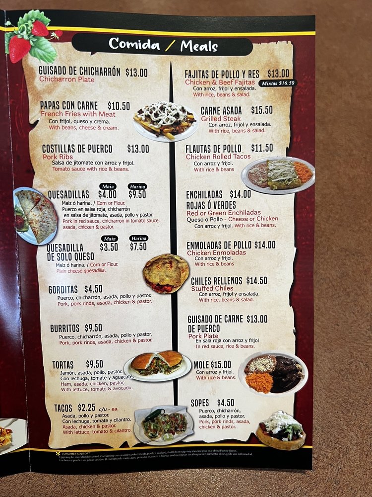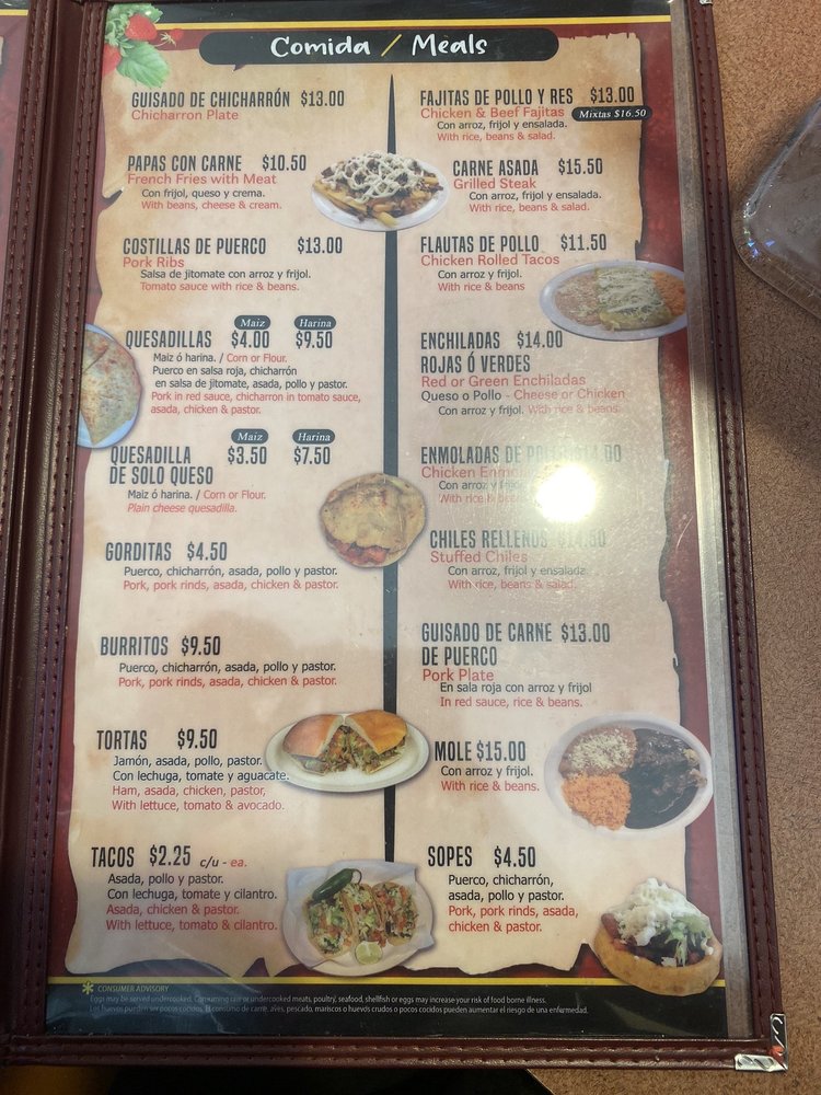 Puerco, chicharrón, asada, pollo y pastor. Pork, pork rinds, asada, chicken & pastor.
